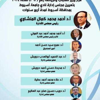 الدكتور المنشاوي يهنئ أعضاء مجلس إدارة نادي جامعة أسيوط بصدور قرار وزير الشباب والرياضة بتشكيل مجلس الإدارة