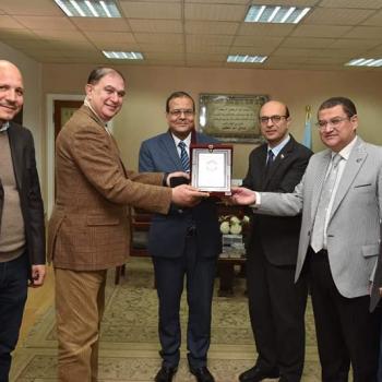 نائب رئيس جامعة أسيوط يتلقى درعاً للتكريم من رئيس جامعة سوهاج خلال زيارته لتفقد المبنى الجديد لقسم جراحة القلب والصدر بطب سوهاج ولمناقشة رسالة دكتوراة بالقسم