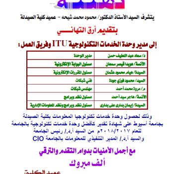 وحدة الخدمات التكنولوجية بكلية الصيدلة تحصل علي شهادة تقدير كأفضل وحدة خدمات تكنولوجية بالجامعة للعام 2017-2018م.