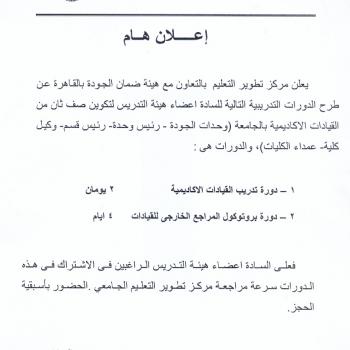 يعلن مركز تطوير التعليم عن انعقاد دورات تدريبية بالتعاون مع هيئة ضمان الجودة بالقاهرة