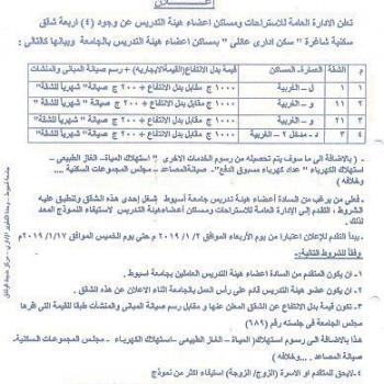 تعلن الادارة العامة للاستراحات ومساكن اعضاء هيئة التدريس عن وجود (4) شقق سكنية شاغرة "سكن ادارى عائلى" بمساكن اعضاء هيئة التدريس بالجامعة وبياتها كالتالى: