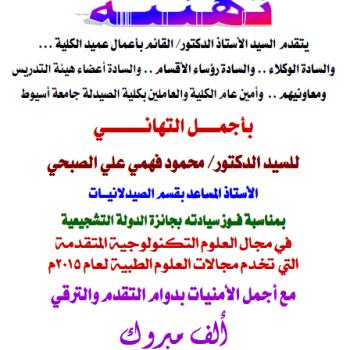 أسرة كلية الصيدلة تتقدم بخالص التهنئة للسيد الدكتور/ محمود فهمي علي الصبحي بمناسبة فوز سيادته بجائزة الدولة التشجيعية في مجال العلوم التكنولوجية المتقدمة التي تخدم مجالات العلوم الطبية لعام 2015م.