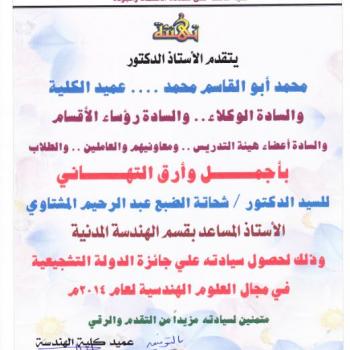 تهنئة من كلية الهندسة للسيد الدكتور / شحاته الضبع عبدالرحيم الأستاذ المساعد بقسم المدنية