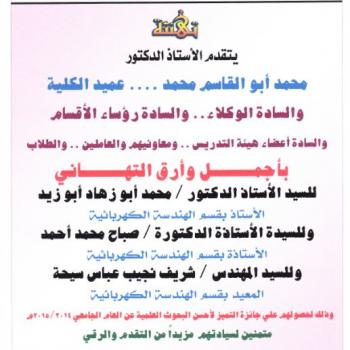 تهنئة من كلية الهندسة لكلاً من الأستاذ الدكتور/ محمد أبو زهاد - والأستاذة الدكتورة/ صباح محمد -بقسم الهندسة الكهربائية