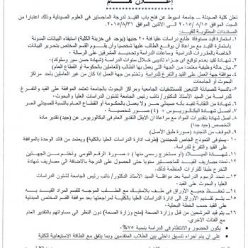 تعلن كلية الصيدلة جامعة أسيوط عن فتح باب القيد لدرجة الماجستير في العلوم الصيدلية اعتباراً من يوم السبت الموافق 15/8/2015 حتى الاثنين الموافق 31/8/2015م.