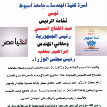 تهنئة أسرة كلية الهندسة بجامعة أسيوط بمناسبة افتتاح قناة السويس الجديدة