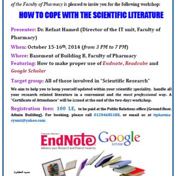 ورشة عمل بكلية الصيدلة عن الاستخدام الأمثل لـ Endnote, Readcube and Google Scholar يومي 15 ، 16/10/2014م.