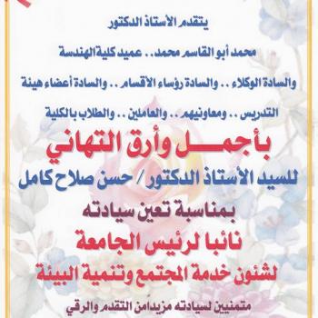 تهنئة من السيد الأستاذ الدكتور/ محمود عبد الناصر علي مدير وحدة إدارة المشروعات بالجامعة يتقدم بأرق التهانى لسيادة الأستاذ الدكتور حسن صلاح كامل بمناسبة تعيين سيادته نائباً لرئيس الجامعة