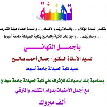 تهنئة للسيد الأستاذ الدكتور/ جمال أحمد صالح عميد كلية الصيدلة بمناسبة إنتداب سيادته للإشراف علي كلية الصيدلة جامعة سوهاج.