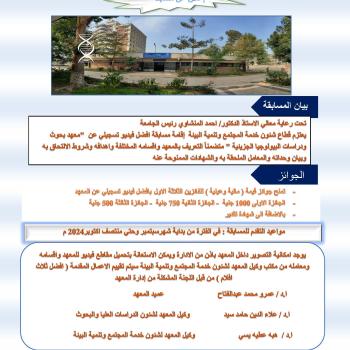 يعلن قطاع شئون خدمة المجتمع وتنمية البيئة عن مسابقة افضل فيديو تسجيلى عن معهد بحوث ودراسات البيولوجيا الجزيئية