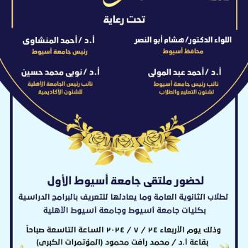 تحت رعاية الدكتور أحمد المنشاوي رئيس جامعة أسيوط، وبحضور اللواء الدكتور/ هشام أبو النصر محافظ أسيوط، تطلق جامعة أسيوط، غداً الأربعاء الموافق ٢٤ من يوليو، في تمام الساعة التاسعة صباحاً، بقاعة…