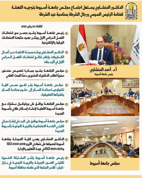 بالانفوجراف .. أبرز قرارات مجلس جامعة أسيوط في اجتماعه الدوري برئاسة الدكتور أحمد المنشاوي، المنعقد في ٢٠ يناير ٢٠٢٦م. 20 يناير 2026 بالانفوجراف .. أبرز قرارات مجلس جامعة أسيوط في اجتماعه الدوري برئاسة الدكتور أحمد المنشاوي، المنعقد في ٢٠ يناير ٢٠٢٦م.