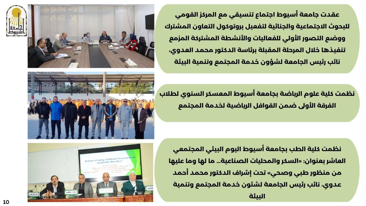 • عقدت جامعة أسيوط اجتماع تنسيقي مع المركز القومي للبحوث الاجتماعية والجنائية لتفعيل بروتوكول التعاون المشترك ووضع التصور الأولي للفعاليات والأنشطة المشتركة المزمع تنفيذها خلال المرحلة المقبلة برئاسة الدكتور محمد العدوي، نائب رئيس الجامعة لشؤون خدمة المجتمع وتنمية البيئة.