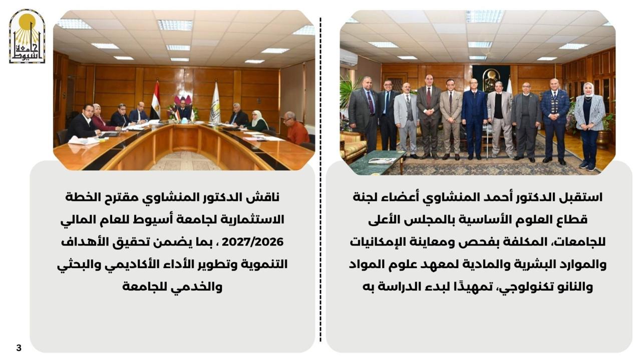 • ناقش الدكتور المنشاوي مقترح الخطة الاستثمارية لجامعة أسيوط للعام المالي 2026/2027 ، بما يضمن تحقيق الأهداف التنموية وتطوير الأداء الأكاديمي والبحثي والخدمي للجامعة.