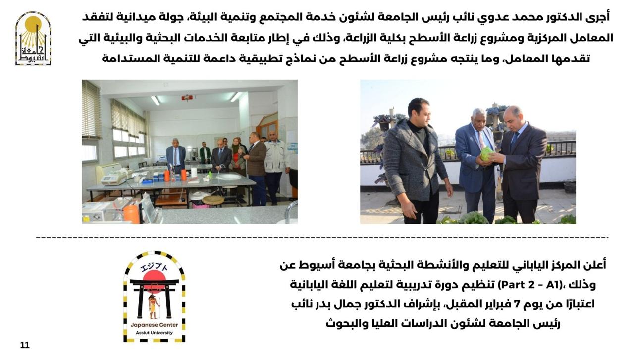 • أجرى الدكتور محمد عدوي نائب رئيس الجامعة لشئون خدمة المجتمع وتنمية البيئة، جولة ميدانية لتفقد المعامل المركزية ومشروع زراعة الأسطح بكلية الزراعة، وذلك في إطار متابعة الخدمات البحثية والبيئية التي تقدمها المعامل، وما ينتجه مشروع زراعة الأسطح من نماذج تطبيقية داعمة للتنمية المستدامة.