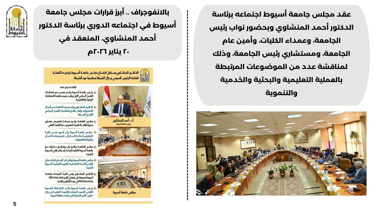 • بالانفوجراف .. أبرز قرارات مجلس جامعة أسيوط في اجتماعه الدوري برئاسة الدكتور أحمد المنشاوي، المنعقد في ٢٠ يناير ٢٠٢٦م.