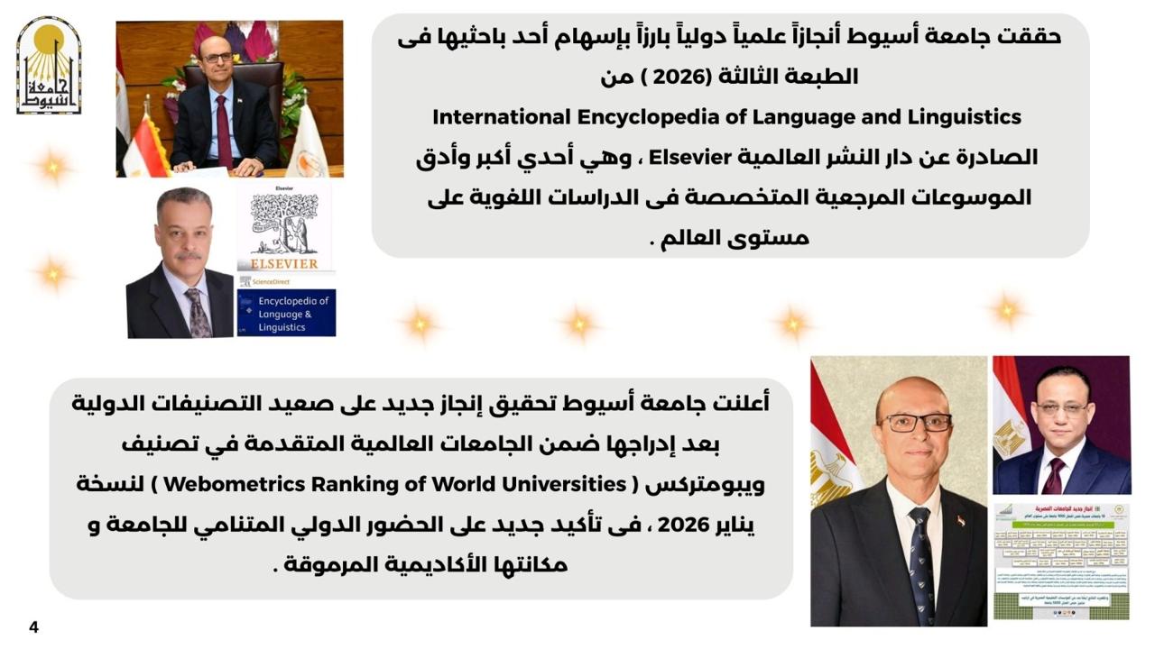 • حققت جامعة أسيوط إنجازًا علميًا دوليًا بارزًا بإسهام أحد باحثيها في الطبعة الثالثة (2026) من International Encyclopedia of Language and Linguistics الصادرة عن دار النشر العالمية Elsevier، وهي إحدى أكبر وأدق الموسوعات المرجعية المتخصصة في الدراسات اللغوية على مستوى العالم.