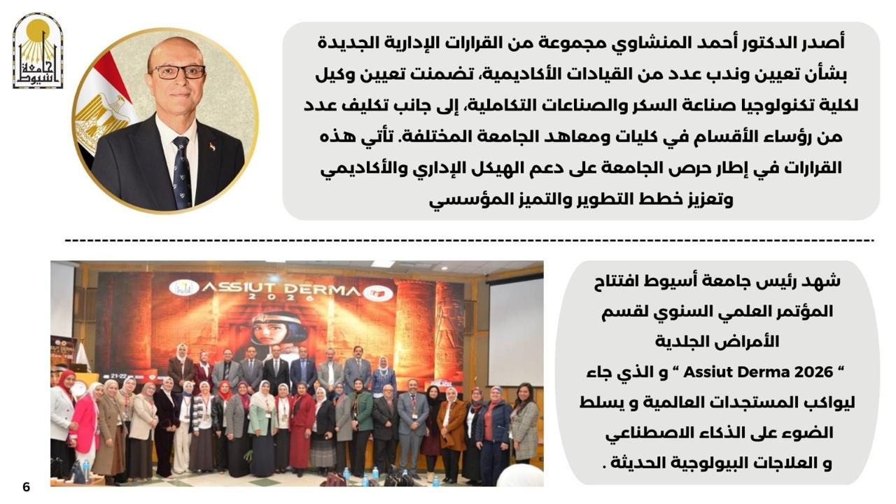 • شهد رئيس جامعة أسيوط افتتاح المؤتمر العلمي السنوي لقسم الأمراض الجلدية «Assiut Derma 2026» والذي جاء ليواكب المستجدات العالمية وتسلط الضوء على الذكاء الاصطناعي والعلاجات البيولوجية الحديثة.