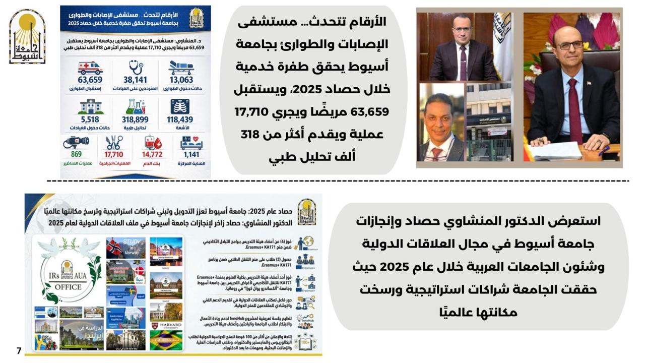 • استعرض الدكتور المنشاوي حصاد وإنجازات جامعة أسيوط في مجال العلاقات الدولية وشئون الجامعات العربية خلال عام 2025 حيث حققت الجامعة شراكات استراتيجية ورسخت مكانتها عالميًا.