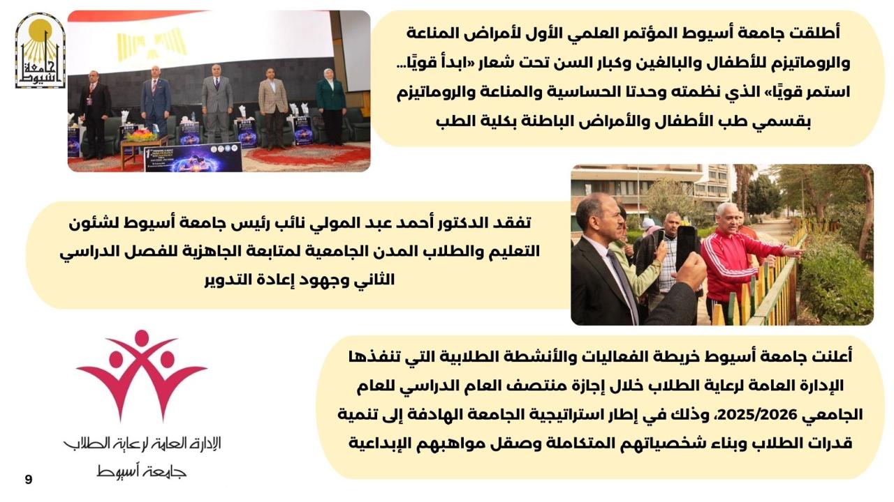 • أعلنت جامعة أسيوط خريطة الفعاليات والأنشطة الطلابية التي تنفذها الإدارة العامة لرعاية الطلاب خلال إجازة منتصف العام الدراسي للعام الجامعي 2025/2026، وذلك في إطار استراتيجية الجامعة الهادفة إلى تنمية قدرات الطلاب وبناء شخصياتهم المتكاملة وصقل مواهبهم الإبداعية.