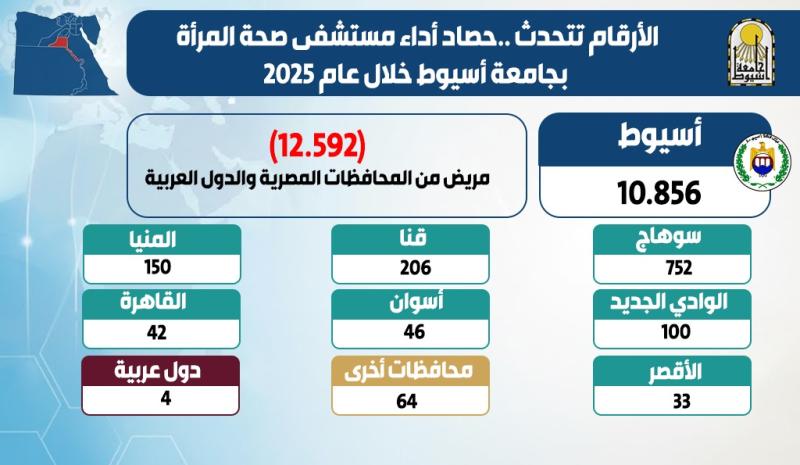 وفي السياق ذاته، أضاف الدكتور أحمد إبراهيم حسانين أن مستشفى صحة المرأة الجامعي استقبل خلال عام 2025 عدد (12.592) حالة من مختلف المحافظات المصرية والدول العربية، من بينهم (10.856) حالة من محافظة أسيوط، و(752) حالة من محافظة سوهاج، و(206) حالات من محافظة قنا، و(150) حالة من محافظة المنيا، و(100) حالة من محافظة الوادي الجديد، و(46) حالة من محافظة أسوان، و(42) حالة من محافظة القاهرة، و(33) حالة من محافظة الأقصر، إلى جانب (64) حالة من محافظات أخرى، فضلًا عن استقبال (4) حالات من دول عربية هي السودان واليمن.