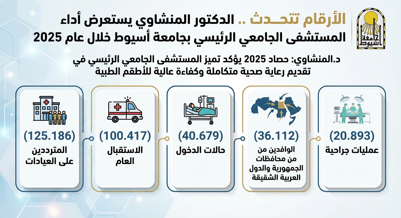 كشف المستشفى الجامعي الرئيسي بجامعة أسيوط عن أدائه خلال عام (2025)، وذلك تحت رعاية الدكتور أحمد المنشاوي، رئيس جامعة أسيوط، وإشراف الدكتور علاء عطية، عميد كلية الطب ورئيس مجلس إدارة المستشفيات الجامعية، وبمتابعة الدكتور خالد عبدالعزيز، مدير المستشفى، موضحًا مؤشرات العمل والخدمات الطبية المقدمة للمرضى، في إطار المتابعة الدورية لتقييم مستوى الأداء، والوقوف على حجم المترددين والحالات التي تم التعامل معها على مدار العام.