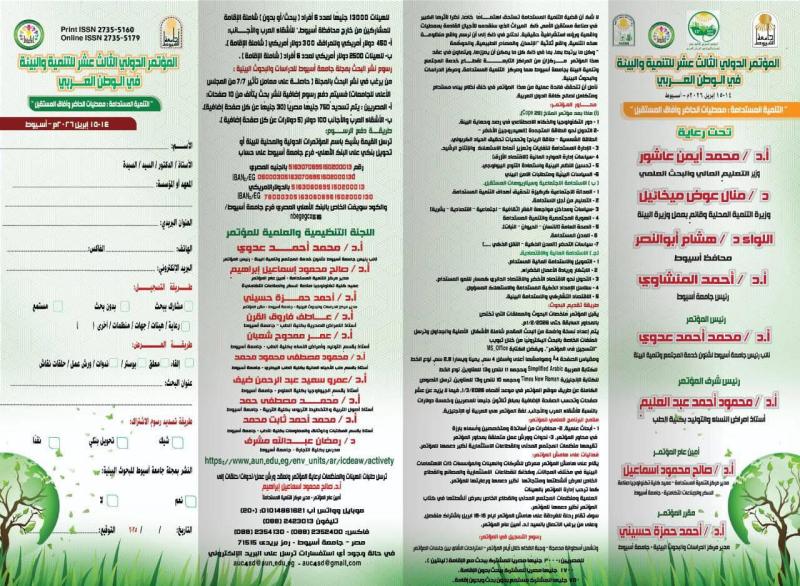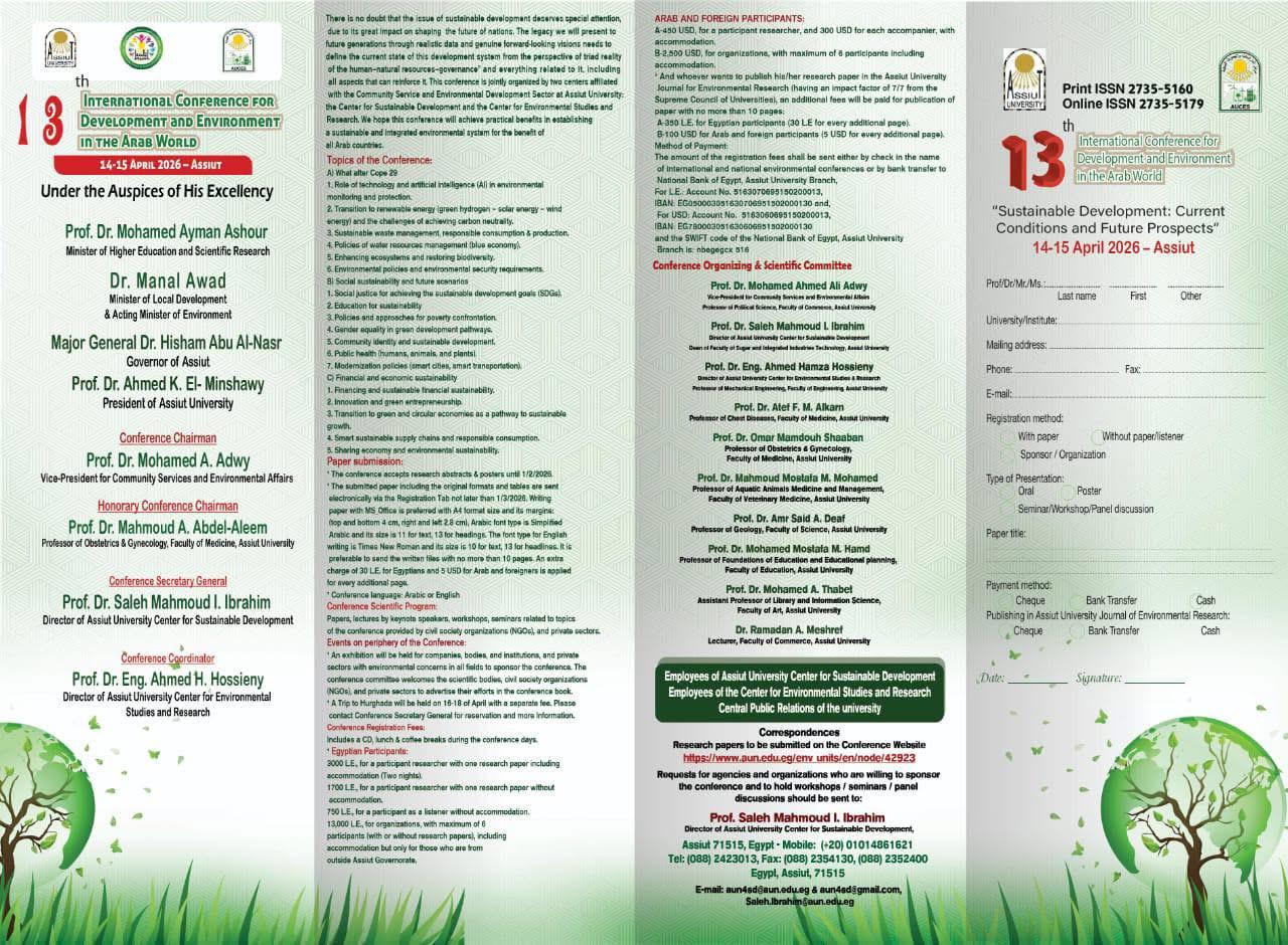 تتشرف جامعة أسيوط، برئاسة الدكتور أحمد المنشاوي رئيس الجامعة، بدعوة السادة العلماء والباحثين والخبراء والمهتمين بقضايا التنمية والبيئة للمشاركة في المؤتمر الدولي الثالث عشر للتنمية والبيئة في الوطن العربي، والذي يُعقد تحت عنوان: «التنمية المستدامة: معطيات الحاضر وآفاق المستقبل»، وذلك خلال يومي 14 و15 أبريل المقبل.