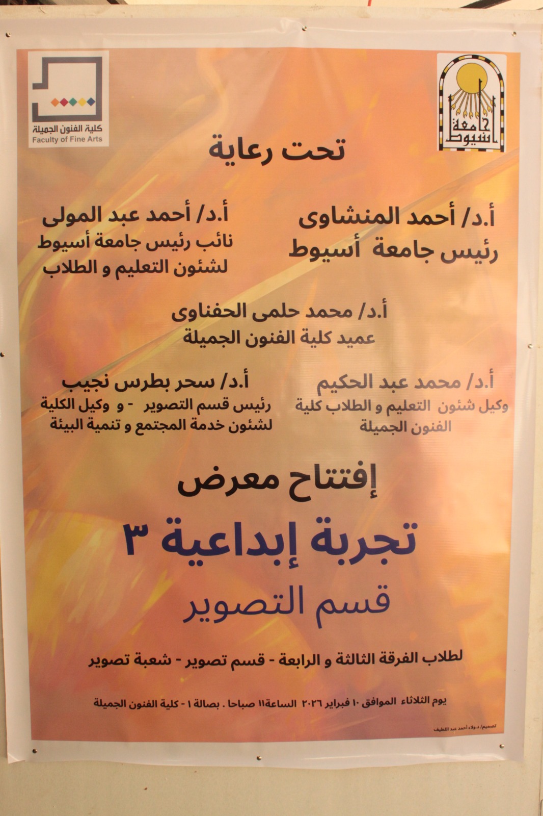 تحت رعاية الدكتور أحمد المنشاوي رئيس جامعة أسيوط، افتتح الدكتور أحمد عبد المولى نائب رئيس الجامعة لشئون التعليم والطلاب، معرض «تجربة إبداعية (3)»، الذي نظمته كلية الفنون الجميلة اليوم الثلاثاء الموافق 10 فبراير، بقاعة معارض الكلية بصالات الامتحانات.