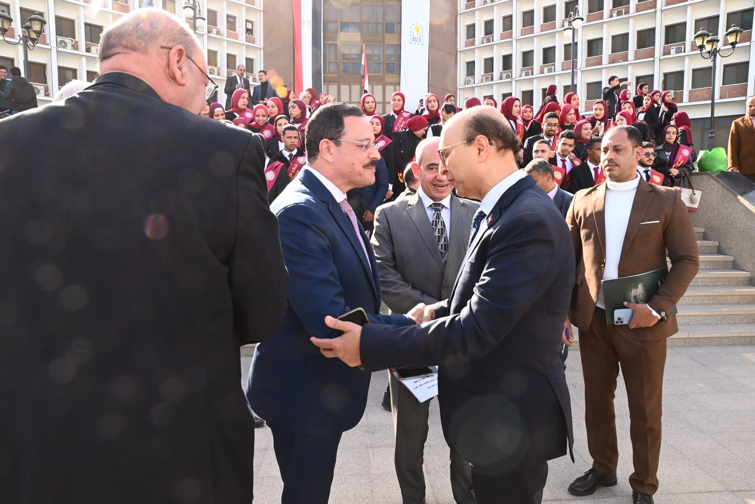 وشهد اللقاء حضور الدكتور أحمد عبد المولى نائب رئيس الجامعة لشئون التعليم والطلاب، والدكتور جمال بدر نائب رئيس الجامعة لشئون الدراسات العليا والبحوث، والدكتور محمد عدوي نائب رئيس الجامعة لشئون خدمة المجتمع وتنمية البيئة، وشوكت صابر أمين عام الجامعة، إلى جانب عدد من القيادات العسكرية والأمنية، وعمداء الكليات