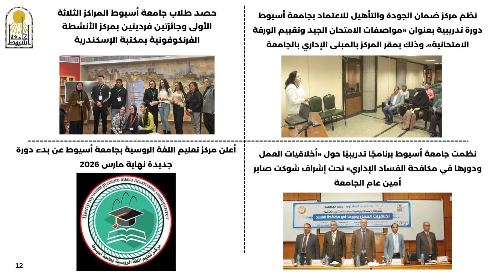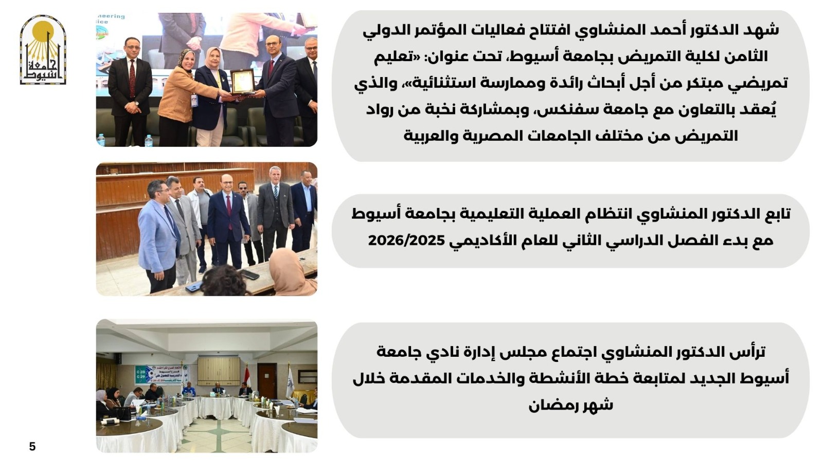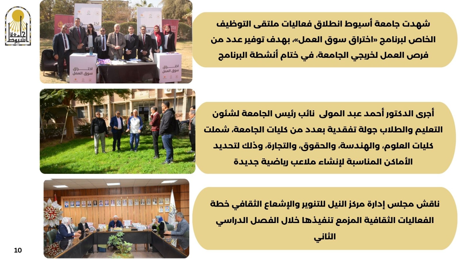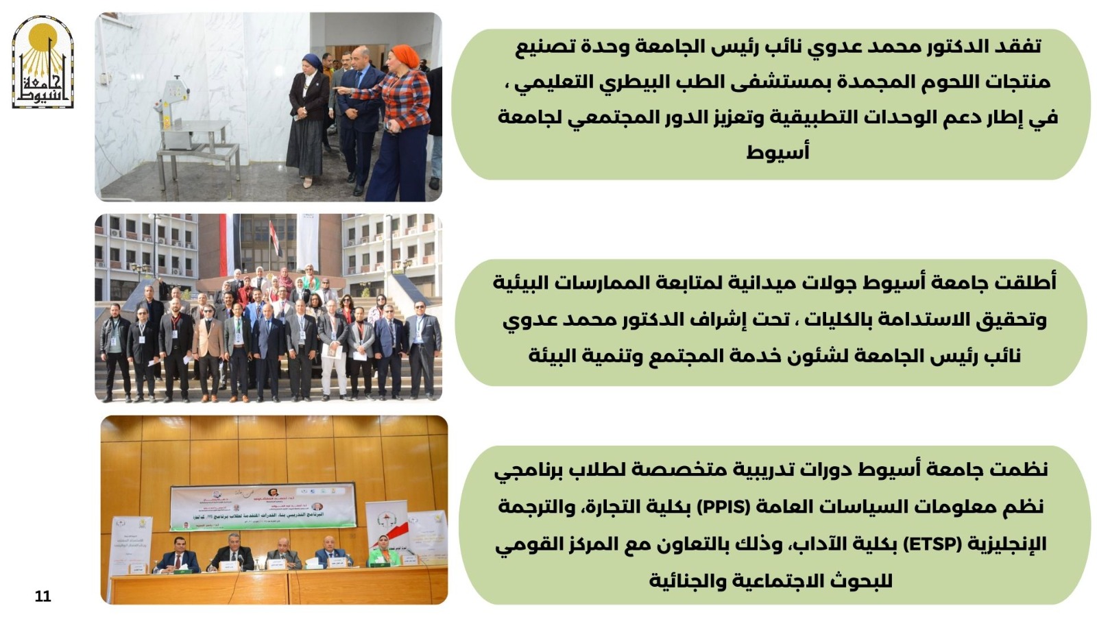 حيث شهدت جامعة أسيوط العديد من الفعاليات والأنشطة والتي عكست التزام الجامعة بالتميز الأكاديمي، والمشاركة الفعالة في قضايا المجتمع، وعززت مكانتها كمؤسسة تعليمية رائدة تسهم في تحقيق أهداف التنمية المستدامة ورؤية مصر 2030