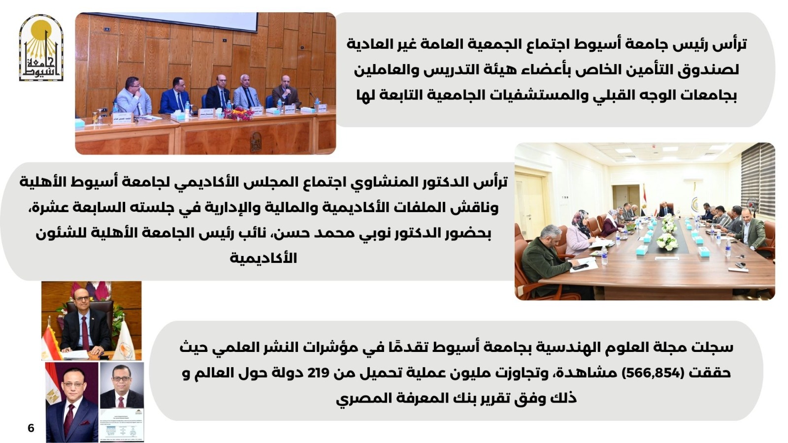 • سجلت مجلة العلوم الهندسية بجامعة أسيوط تقدمًا في مؤشرات النشر العلمي حيث حققت (566,854) مشاهدة، وتجاوزت مليون عملية تحميل من 219 دولة حول العالم و ذلك وفق تقرير بنك المعرفة المصري.