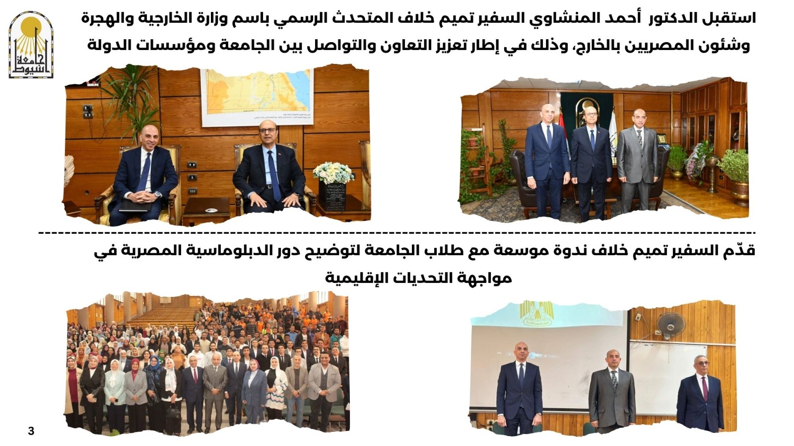 • استقبل الدكتور أحمد المنشاوي السفير تميم خلاف المتحدث الرسمي باسم وزارة الخارجية والهجرة وشئون المصريين بالخارج، وذلك في إطار تعزيز التعاون والتواصل بين الجامعة ومؤسسات الدولة.