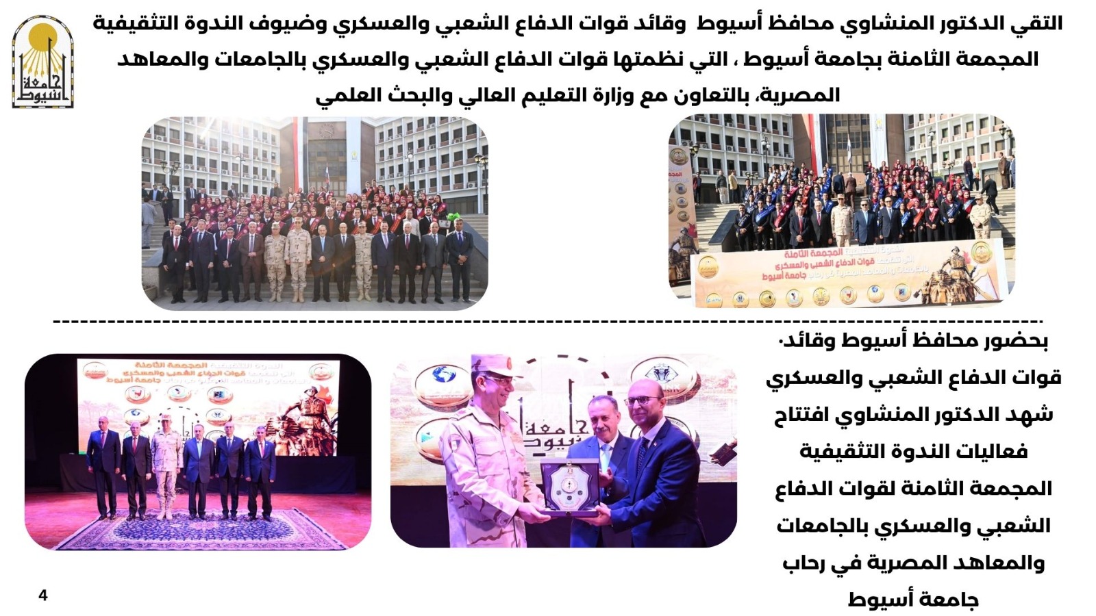شهد الدكتور المنشاوي افتتاح فعاليات الندوة التثقيفية المجمعة الثامنة لقوات الدفاع الشعبي والعسكري بالجامعات والمعاهد المصرية في رحاب جامعة أسيوط.