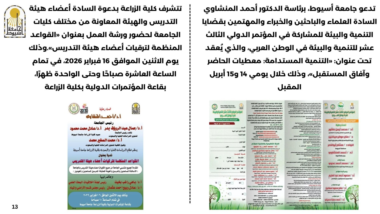 • تدعو جامعة أسيوط، برئاسة الدكتور أحمد المنشاوي السادة العلماء والباحثين والخبراء والمهتمين بقضايا التنمية والبيئة للمشاركة في المؤتمر الدولي الثالث عشر للتنمية والبيئة في الوطن العربي، والذي يُعقد تحت عنوان: «التنمية المستدامة: معطيات الحاضر وآفاق المستقبل»، وذلك خلال يومي 14 و15 أبريل المقبل.