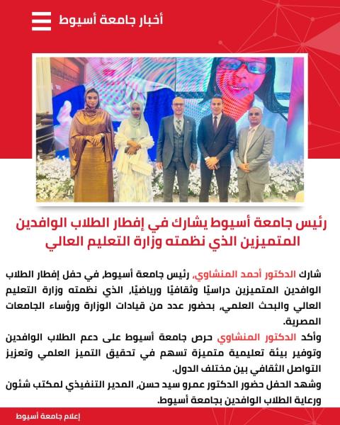 الدكتور المنشاوي رئيس جامعة أسيوط يشارك في حفل إفطار الطلاب الوافدين المتميزين، الذي نظمته وزارة التعليم العالي والبحث العلمي، وذلك في إطار دعم الدولة للطلاب الوافدين وتعزيز مكانة مصر كوجهة تعليمية رائدة.