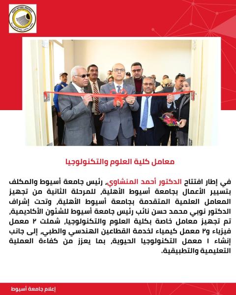 في إطار افتتاح الدكتور أحمد المنشاوي، رئيس جامعة أسيوط والمكلف بتسيير أعمال جامعة أسيوط الأهلية، للمرحلة الثانية من تجهيز المعامل العلمية المتقدمة، يوم الأربعاء 18 مارس 2026، وتحت إشراف الدكتور نوبي محمد حسن نائب رئيس جامعة أسيوط الأهلية للشئون الأكاديمية، تم تجهيز معامل كلية العلوم والتكنولوجيا.
