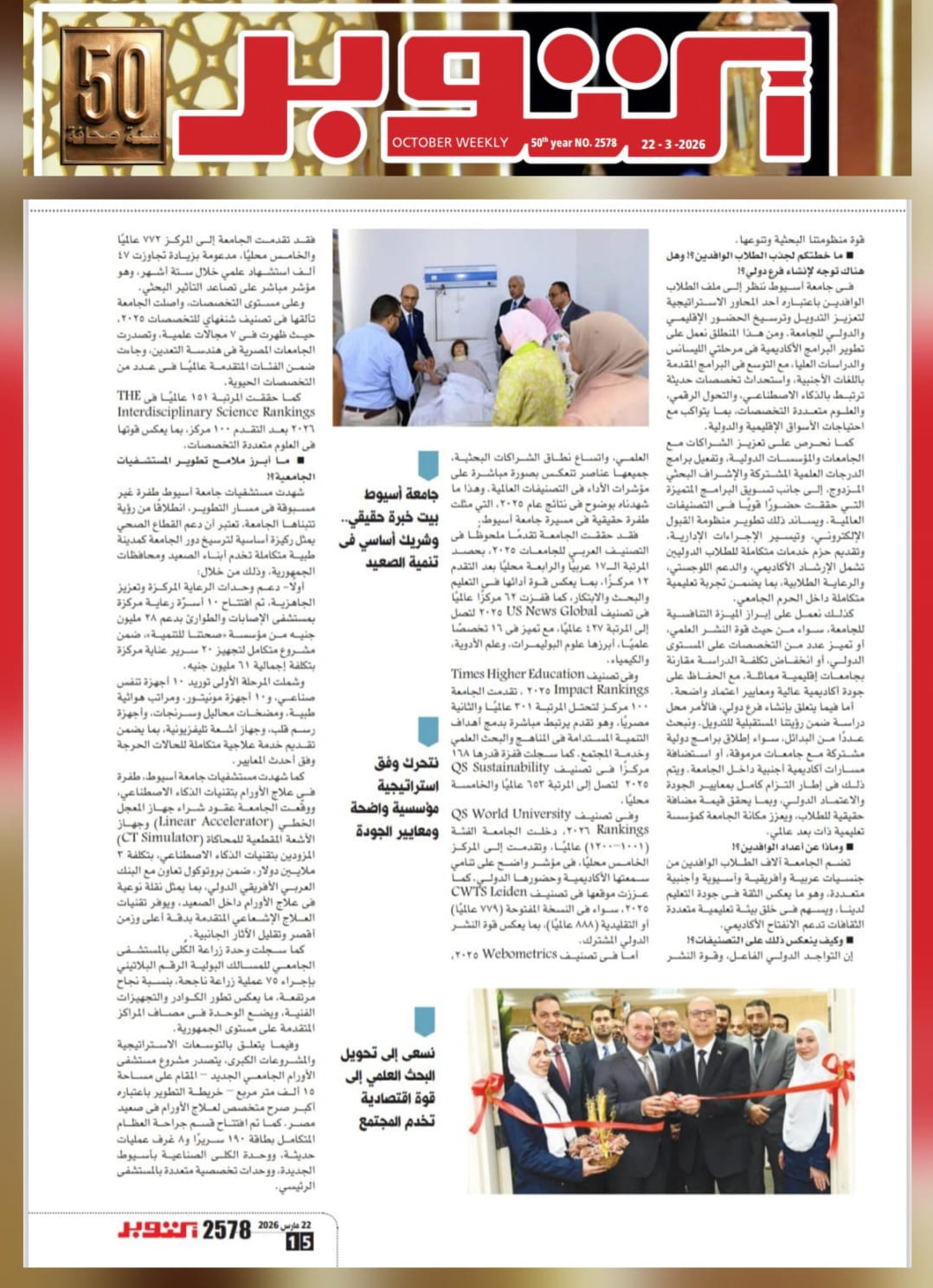 حوار مهم للدكتور أحمد المنشاوي رئيس جامعة أسيوط مع مجلة أكتوبر، يستعرض خلاله رؤية الجامعة لمستقبل التعليم العالي، مؤكدًا أهمية التخصصات البينية وربط البحث العلمي باحتياجات التنمية، بما يعكس توجهًا واضحًا نحو إعداد كوادر قادرة على المنافسة محليًا ودوليًا.