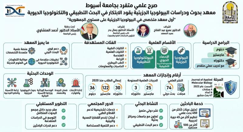 يُعد معهد بحوث ودراسات البيولوجيا الجزيئية بجامعة أسيوط أحد النماذج الرائدة والمتخصصة على مستوى الجمهورية، لما يتميز به من خصوصية علمية تجمع بين التخصصات المختلفة في إطار تكاملي يدعم البحث البيني، ويواكب التطورات المتسارعة في مجالات البيولوجيا الجزيئية والتقنيات الحيوية الحديثة، بما يسهم في إعداد كوادر علمية مؤهلة قادرة على الابتكار والمنافسة.