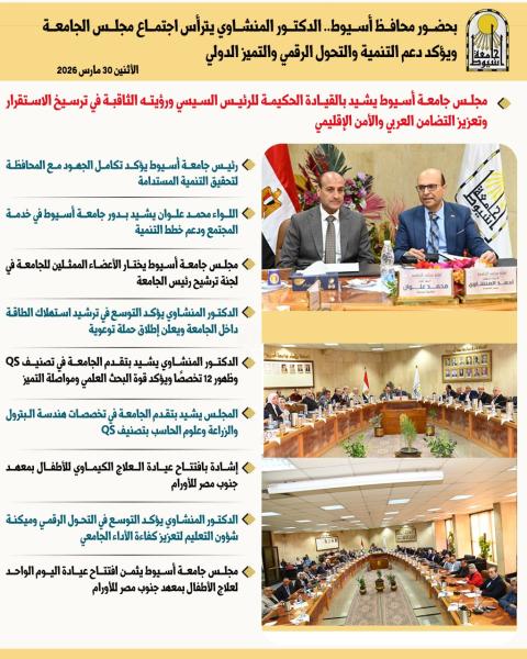 بالانفوجراف .. أبرز قرارات مجلس جامعة أسيوط 30 مارس 2026 بالانفوجراف .. أبرز قرارات مجلس جامعة أسيوط في اجتماعه الدوري برئاسة الدكتور أحمد المنشاوي، المنعقد في ٣٠ مارس ٢٠٢٦.