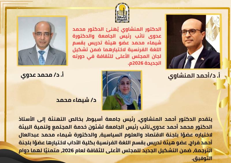 يتقدم الأستاذ الدكتور أحمد المنشاوي، رئيس جامعة أسيوط، بخالص التهنئة إلى الأستاذ الدكتور محمد عدوي، نائب رئيس الجامعة لشئون خدمة المجتمع وتنمية البيئة، والدكتورة شيماء محمد عبدالعال، عضو هيئة تدريس بقسم اللغة الفرنسية بكلية الآداب، وذلك بمناسبة اختيارهما ضمن تشكيل لجان المجلس الأعلى للثقافة في دورته الجديدة لعام 2026.
