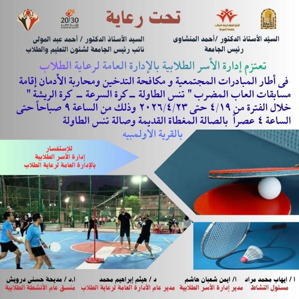كما تتضمن الأنشطة إقامة مسابقات الألعاب المضرب، والتي تشمل تنس الطاولة، وكرة السرعة، وكرة الريشة، خلال الفترة من 19 أبريل حتى 23 أبريل 2026، بالصالة المغطاة القديمة وصالة تنس الطاولة بالقرية الأوليمبية، وذلك يوميًا من الساعة 9 صباحًا حتى 4 عصرًا.