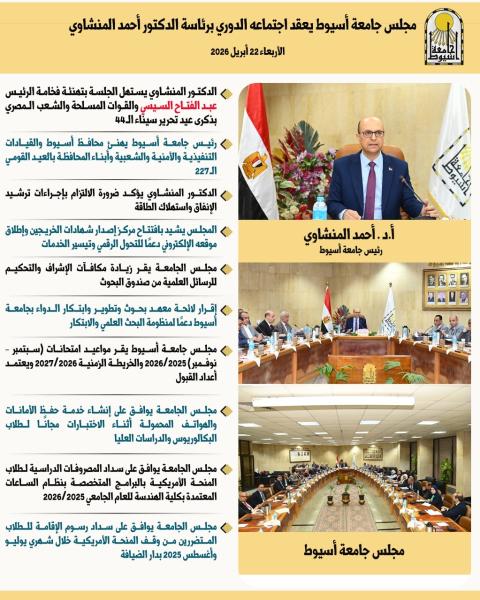 بالإنفوجراف.. أبرز قرارات مجلس جامعة أسيوط في اجتماعه الدوري المنعقد في 22 أبريل 2026م، برئاسة الدكتور أحمد المنشاوي، رئيس الجامعة، حيث شهد الاجتماع اتخاذ مجموعة من القرارات المهمة التي تستهدف دعم وتطوير العملية التعليمية والخدمية، إلى جانب الارتقاء بمنظومة البحث العلمي والدراسات العليا، وتعزيز كفاءة الأداء الأكاديمي والإداري داخل الجامعة، بما يواكب توجهات الدولة نحو تطوير التعليم العالي وتحقيق جودة مخرجاته، والارتقاء الشامل بالمنظومة الجامعية في مختلف قطاعاتها.