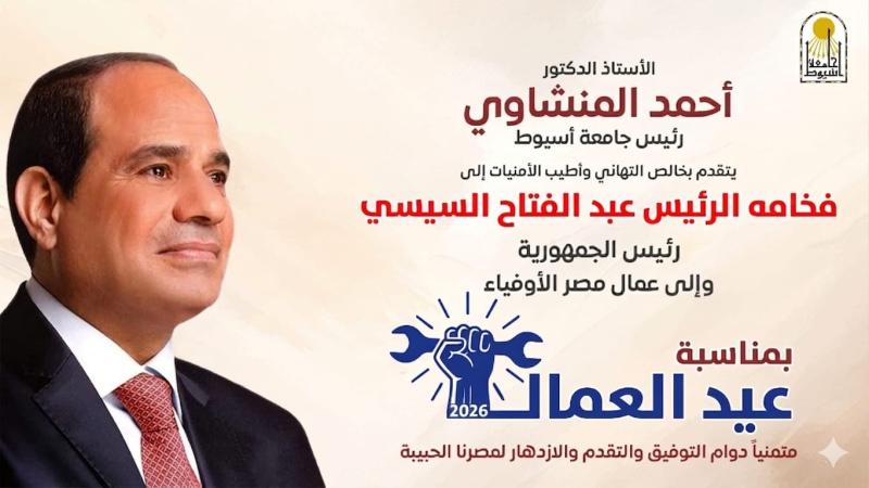 يتقدم الأستاذ الدكتور أحمد المنشاوي، رئيس جامعة أسيوط، بخالص التهنئة إلى فخامة الرئيس عبد الفتاح السيسي، رئيس الجمهورية، بمناسبة الاحتفال بعيد العمال، داعيًا الله أن يعيدها على سيادته بموفور الصحة والعافية، وعلى مصرنا الحبيبة بمزيد من التقدم والازدهار.
