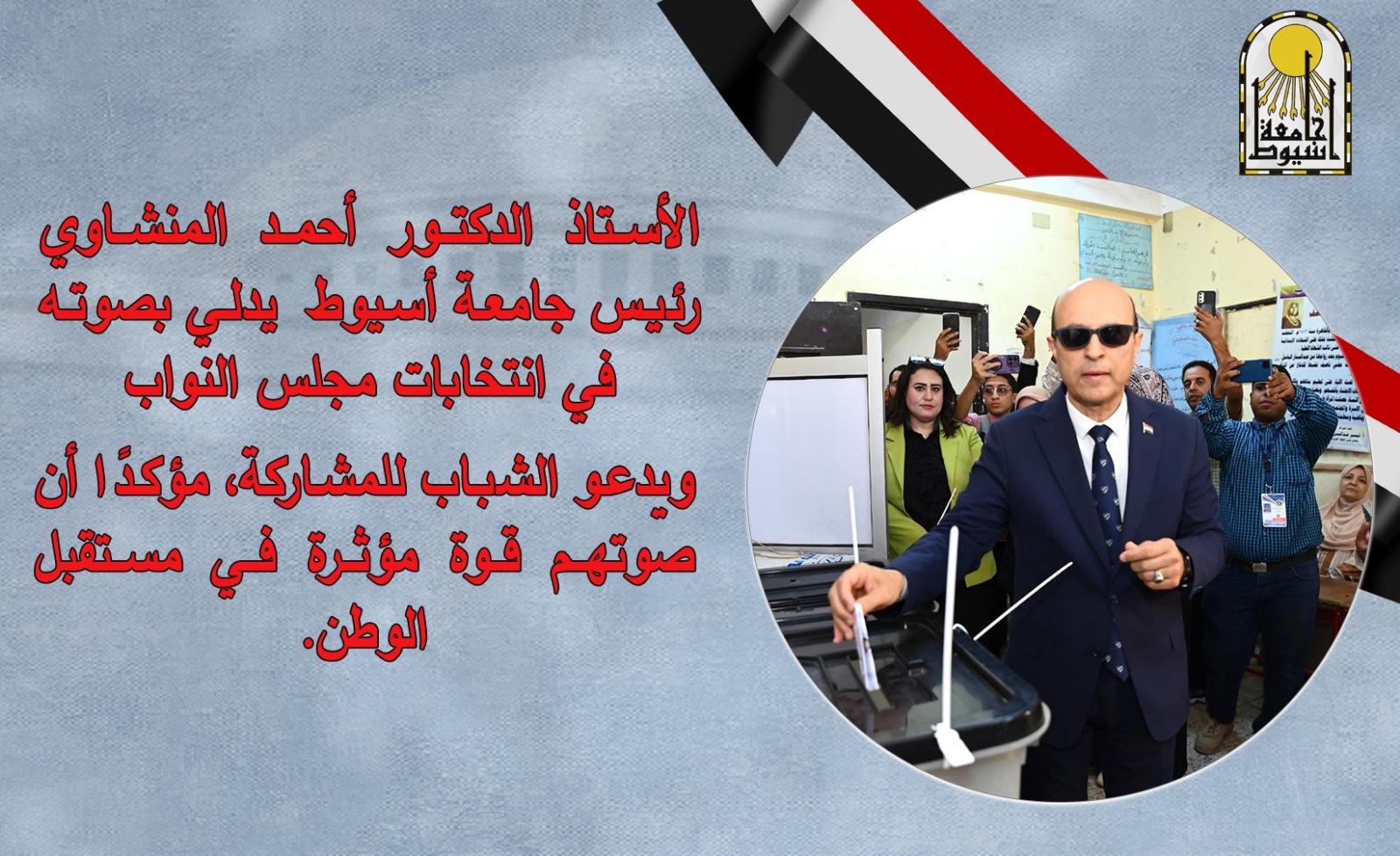 ووجّه رئيس جامعة أسيوط رسالة إلى الشباب والطلاب، داعيًا إياهم إلى أن يكونوا في طليعة المشاركين في الانتخابات، باعتبارهم طاقة الوطن ومستقبله، مؤكدًا أن صوتهم قوة مؤثرة في تشكيل المشهد السياسي وبناء مؤسسات الدولة الحديثة. وأوضح أن المشاركة الفاعلة للشباب والطلاب تعكس وعيهم بأهمية دورهم في دعم استقرار الوطن وتعزيز مسيرة التنمية، مشيرًا إلى أن الجامعة كانت وستظل منبرًا لترسيخ قيم الانتماء والمواطنة لدى أبنائها.