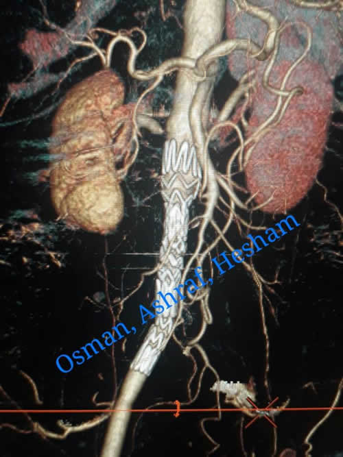 و من جانبه أوضح الدكتور عثمان محمود المدرس بقسم جراحة الأوعية الدموية انه تم تكوين فريق التدخل بالقسطرة يضم الدكتور احمد حسن أستاذ مساعد جراحة الأوعية الدموية ،و الدكتور هشام أبو العيون مدرس جراحة الأوعية الدموية ، و الدكتور اشرف محمد أبو بكر مدرس جراحة الأوعية الدموية ،و بمناظرة المريض و عمل الأشعة و عمل القياسات المطلوبة تبين وجود تمدد و تجمع دموي و نزيف حول ألوصله الشريانية في منطقة اتصالها بالشريان الأورطى.
