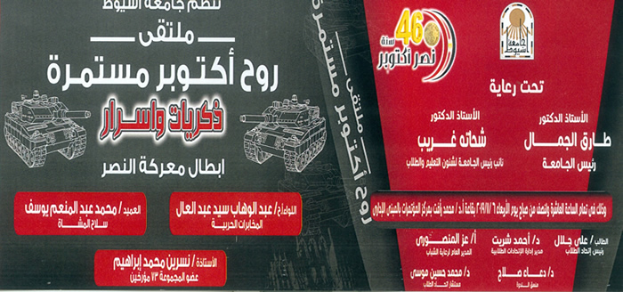 وفى هذا الإطار أعلن الدكتور شحاتة غريب نائب رئيس الجامعة لشئون التعليم والطلاب عن عقد ملتقى موسع غداً الأربعاء 6 من نوفمبر الجاري وذلك بقاعة المؤتمرات الكبرى بالمبنى الإداري تحت شعار " روح أكتوبر مستمرة " والتي تهدف إلى استلهام روح أكتوبر المجيد في تعزيز مشاعر الانتماء الوطني الصادق والمخلص لمصرنا العزيزة ، وكذلك بعث روح العزيمة والإرادة من أجل الحفاظ على الوطن وبناء مستقبله .