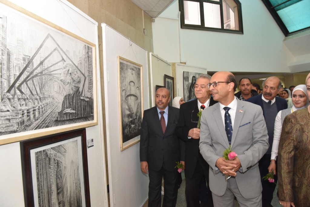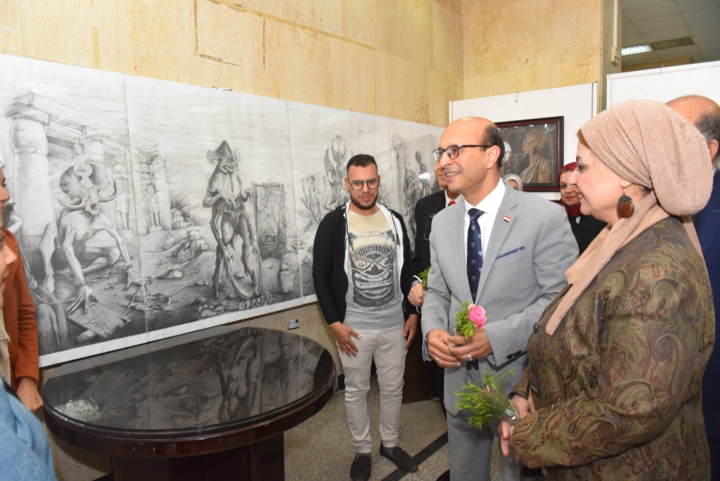 و من جانبه أبدى رئيس الجامعة إعجابه الشديدة بالأعمال الفنية الرائعة بالمعرض و التي تعكس و تبرز ما يتمتع به طلاب كلية الفنون الجميلة من حس جمالي و فني ومواهب متعددة فى فن الرسم ، مؤكداً على حرص الجامعة على تنظيم المسابقة إيماناً منها بمكانة الفن التشكيلي فى المجتمع و إتاحة الفرص لطلاب كلية الفنون الجميلة فى اكتشاف المواهب المتعددة فى فن الرسم و تطوير العملية التعليمية فى كافة الأقسام العلمية و الأكاديمية، كما أن تلك المسابقة متزامنة مع رؤية مصر 2030 هي أجندة وطنية تعكس الخطة الإستراتيجية للدولة لتحقيق مبادئ و أهداف التنمية المستدامة فى كل المجالات منها المعرفة و الابتكار و البحث العلمي و هي ركائز أساسية للتنمية و التحفيز و الابتكار و نشر ثقافة ودعم البحث العلمي