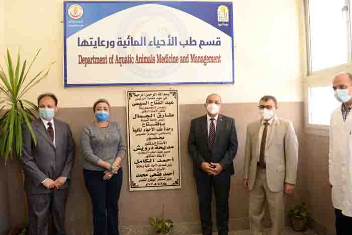 جاء ذلك خلال زيارته للمستشفى والمتضمنة افتتاحه للوحدة المتكاملة لطب الأحياء المائية بقسم طب الأحياء المائية ورعايتها بالمستشفى والتى تعد أول وحدة أحياء مائية متكاملة على مستوى الجمهورية والهادفة إلى تشخيص وعلاج أمراض الأحياء المائية وفق معايير عالمية وذلك بتكلفة إجمالية تفوق الـ 10 ملايين جنيه بتمويل مشترك من وحدة تطوير المشروعات بوزارة التعليم العالى و الجامعة ، جاء ذلك بحضور الدكتورة مديحة درويش عميدة كلية الطب البيطرى ، والأستاذ محمود بخيت أمين عام الجامعة ،والدكتور أحمد فتحي محمد مدير المستشفى ، وفريق العمل القائم على الوحدة وعلى رأسهم الدكتور أحمد عبدالهادى محمد رئيس القسم ، وعدد من كوادر لقسم ومن ضمنهم الدكتور حاتم توغان ، الدكتور محمود مصطفى ، الدكتورة ابتسام سيد ، الدكتورة أميرة مرزوق ، الدكتورة أميمة عبد الرسول ، الدكتورة نجوى رميح ، والباحثة الشيماء محمد .