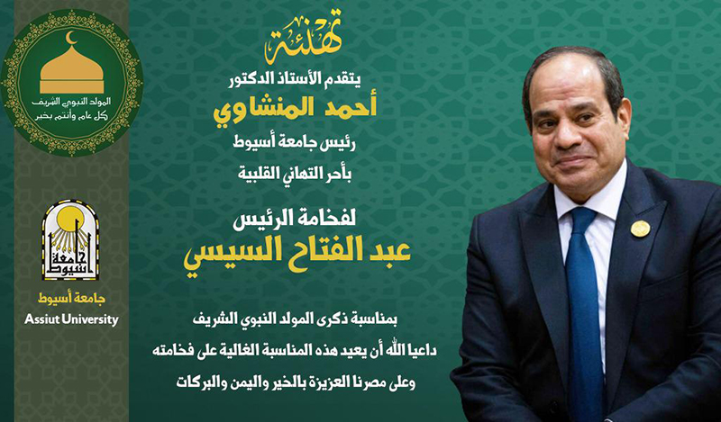 هنأ الدكتور أحمد المنشاوي، رئيس جامعة أسيوط؛ الرئيس عبد الفتاح السيسي، رئيس الجمهورية؛ بمناسبة حلول ذكرى المولد النبوي الشريف.