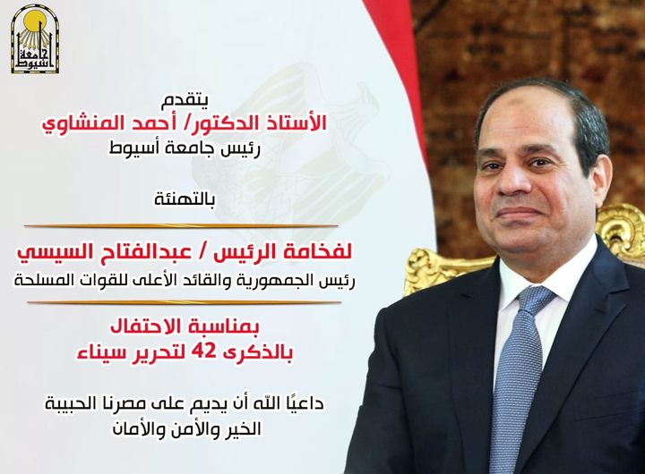 تقدم الدكتور أحمد المنشاوي رئيس جامعة أسيوط، بالأصالة عن نفسه، وبالإنابة عن أسرة جامعة أسيوط؛ بأسمى آيات التهاني للرئيس عبد الفتاح السيسي رئيس الجمهورية، ولرجال القوات المسلحة المصرية البواسل، ولشعب مصر العظيم؛ بمناسبة الذكرى الثانية والأربعين لتحرير أرض سيناء الغالية.